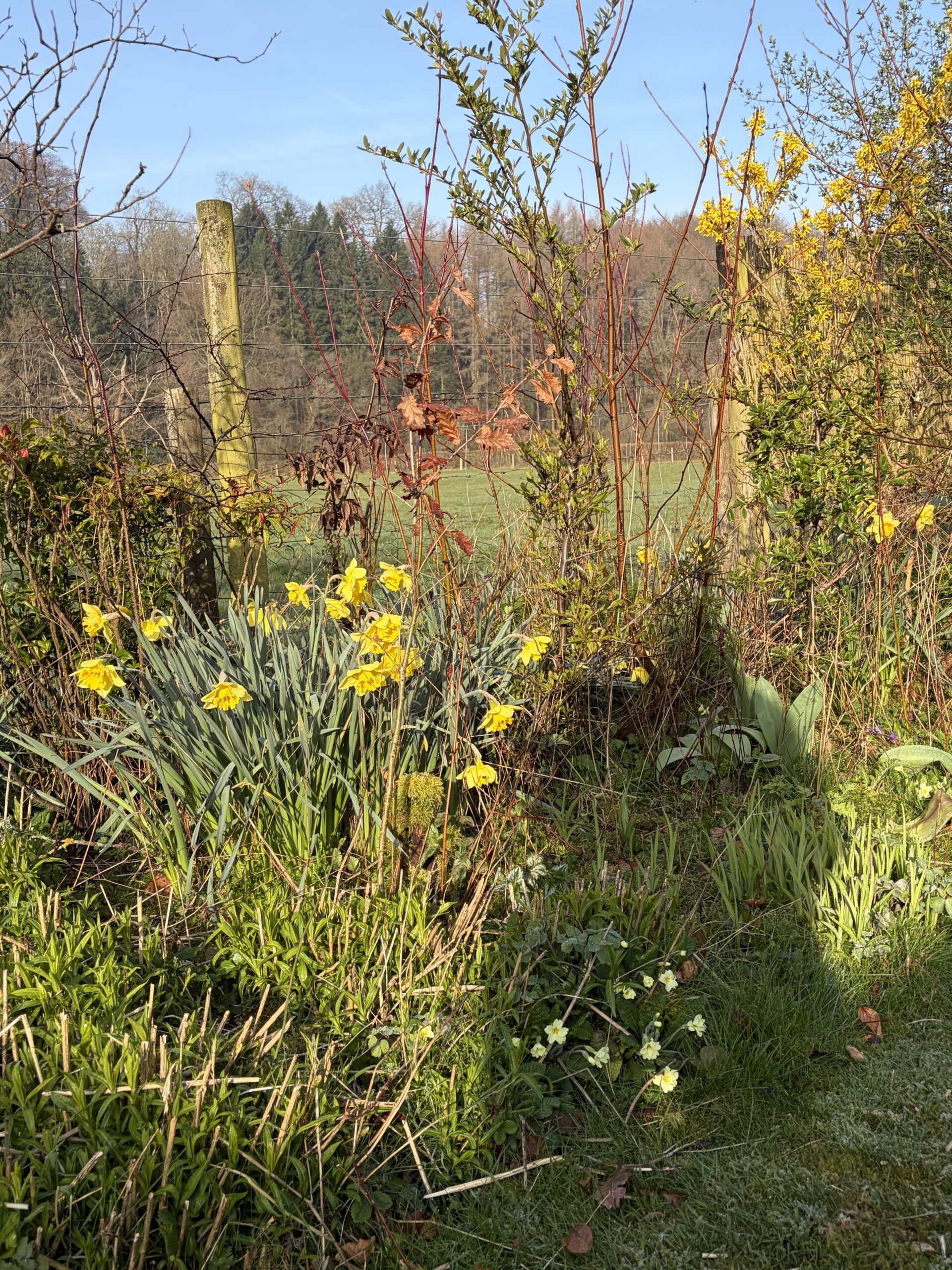 In the wild flower meadow nature has collapsed the daffodils overnight. Slowly, imperceptibly, the daffs are waking as the sun warms them.
