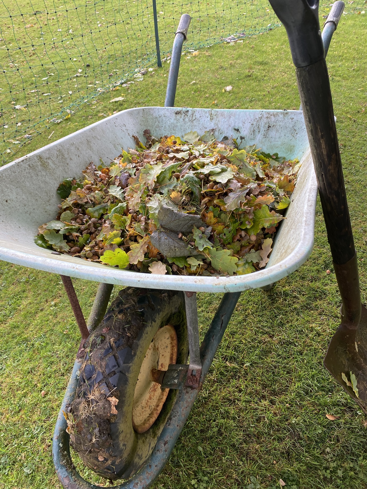 In the absence of a pig we rake them up and put them in the wood – the acorns not the sheep. The amount is