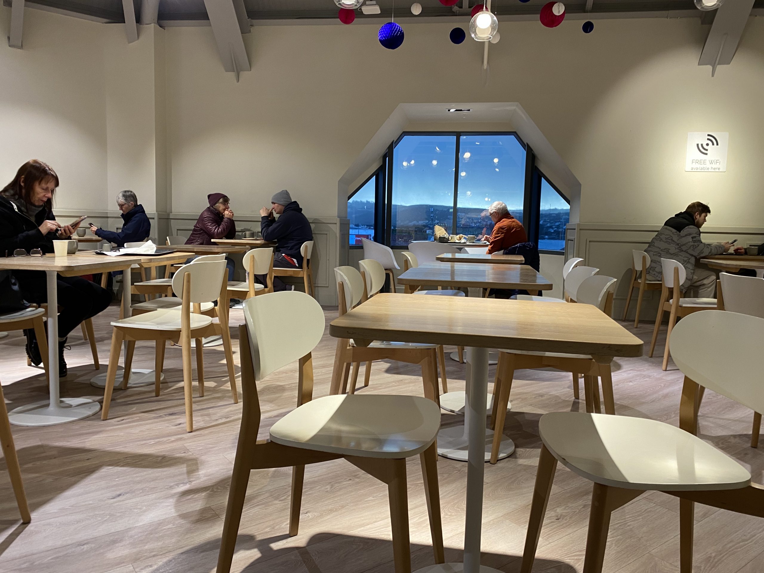 Spotted in Next – a trip to Aberystwyth which is a rare treat as we dislike shopping on a Saturday because all town centres will be packed with Christmas shoppers. It takes an hour – everywhere/anywhere is an hour away, so a half-decent coffee and a bacon bap (Brummie – Ed.) is called for. The view was obscured by a huge black cloud, the reason for which became apparent later when a heavy hail storm hit the town. the view from here…